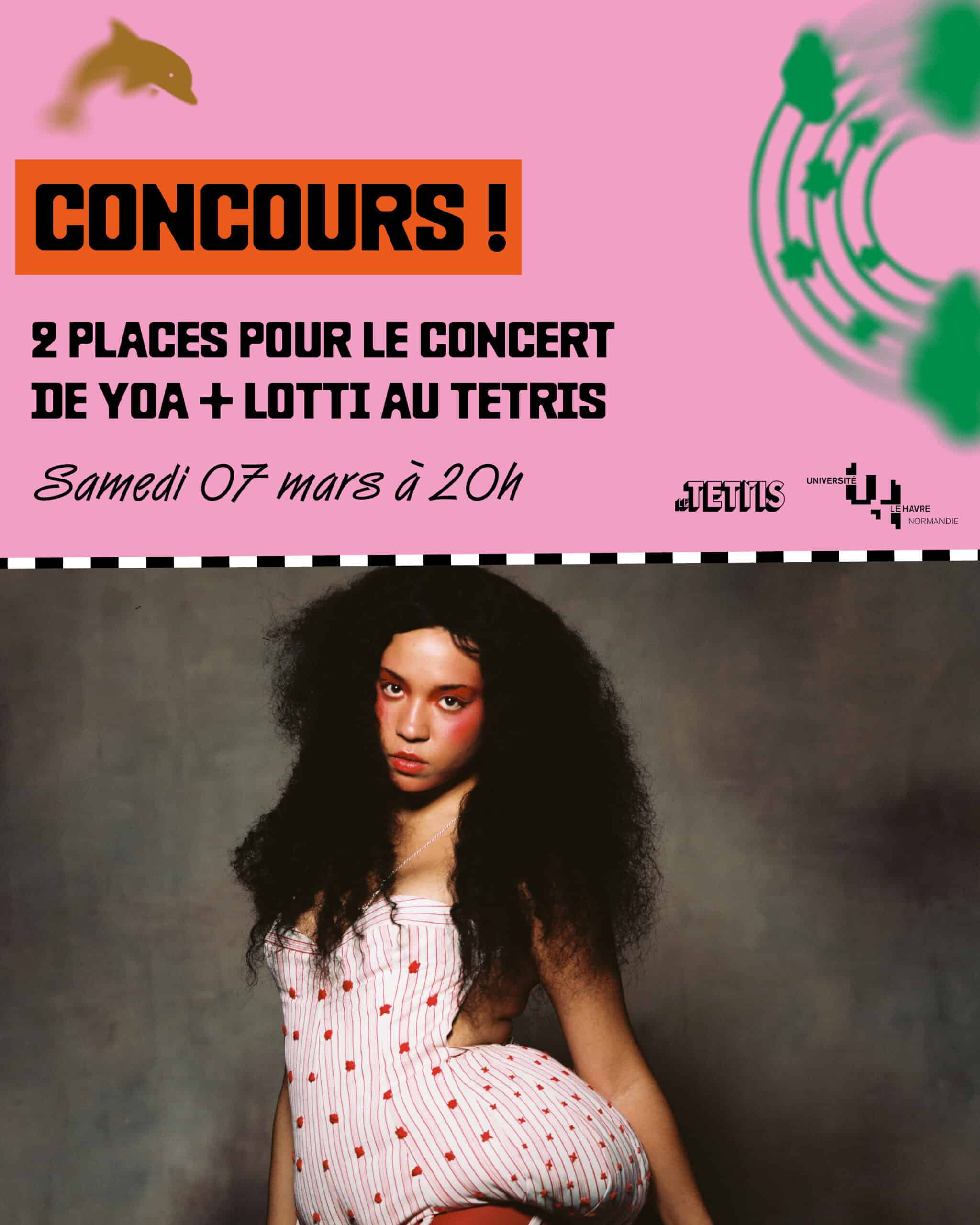 Le Tetris et le pôle culture artistique de la direction Culture art science font gagner aux étudiant.es de l’université 2 X 2 places pour le concert de YOA + Lotti au Tetris ce samedi 7 mars à 20h. Le jeu concours aura lieu jeudi 5 mars en story sur le compte instagram du pôle culture…